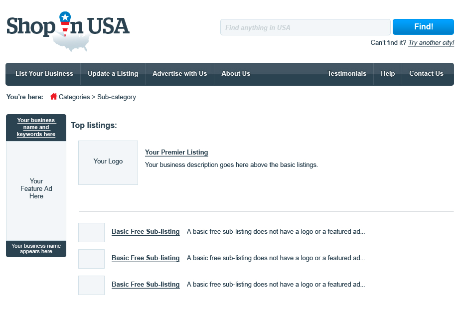 high profile placement above all free listings and one feature ad. With your advertising subscription you can easily change or update your listing and feature ads as often as you like for no extra charge.